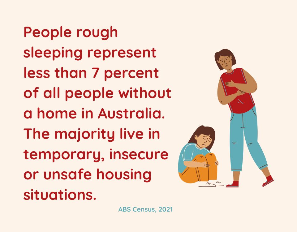 When we think of homelessness, the image that often comes to mind may be of someone sleeping on the street, or ‘rough sleeping’. While this is correct, there are also many other ways a person can be homeless. In fact, ‘rough sleepers’ only make up around 6% of the homelessness population. (ABS Census, 2021)